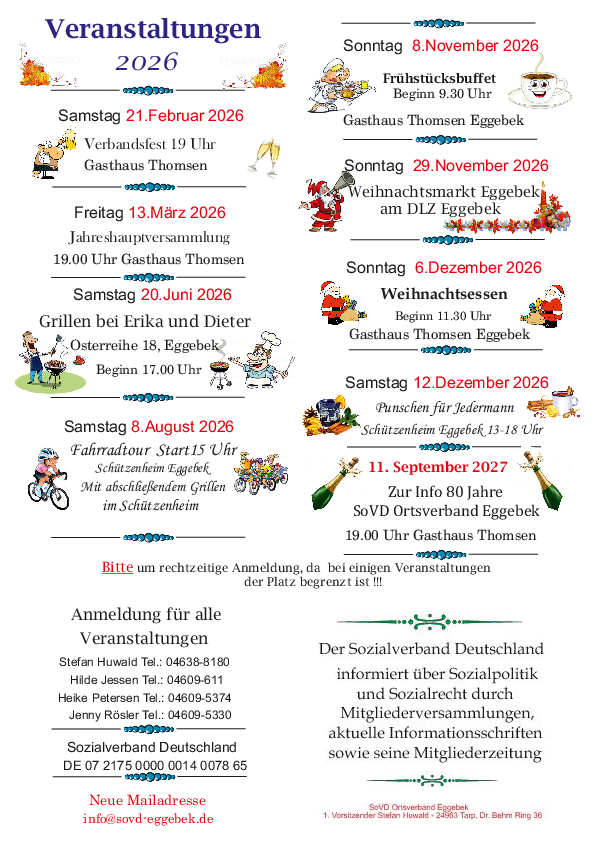 Wir bitten um rechtzeitige Anmeldung, da bei einigen Veranstaltungen der Platz begrenzt ist. Die Kosten der jeweiligen Veranstaltung sind nach einer vorherigen telefonischen Anmeldung auf das Konto des SoVD OV Eggebek bei der NOSPA zu überweisen: IBAN: DE07 2175 0000 0014 0078 65 oder in bar bei der jeweiligen Ansprechperson für die Anmeldungen.