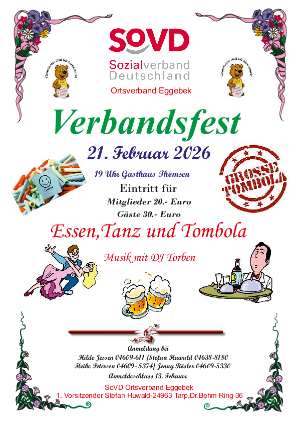 Der Ortsverband Eggebek mit inzwischen über 550 Mitgliedern unterstützt die wertvolle und wichtige Arbeit des SoVD Deutschland aktiv vor Ort und nah an seinen Mitgliedern u.a. durch Hilfestellung und Unterstützung bei Rentenangelegenheiten, Patientenverfügungen, Vorsorgevollmachten, Pflegeanträgen, Schwerbehindertenausweisen und vielem mehr. Zusätzlich bieten wir auch eine Vielzahl von unterschiedlichen und abwechslungsreichen Veranstaltungen im ganzen Jahr. Die regelmäßigen und immer sehr gut besuchten Veranstaltungen stehen den Mitgliedern mit ermäßigten Beiträgen, aber auch Gästen offen. Jeder ist willkommen! Sie benötigen Unterstützung bei einem der genannten Themen oder haben Interesse einer unserer Veranstaltungen zu besuchen, dann melden Sie sich! Wir freuen uns über jedes Mitglied und jeden Gast.