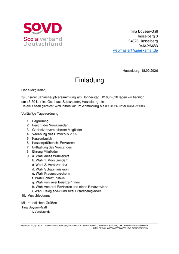 Am 06. März 2025 fand die Jahreshauptversammlung des SoVD Ortsverbandes Schwackendorf im Gasthuus "Spieskamer" statt. Die erste Vorsitzende Frau Tina Boysen Gall begrüßte 37 Mitglieder, und als Gast die Kreisvorsitzende Frau Christiane Tramm. Die erste Vorsitzende berichtete über die verschiedenen Aktivitäten im zurückliegenden Jahr, die von den Mitgliedern gut angenommen wurden.